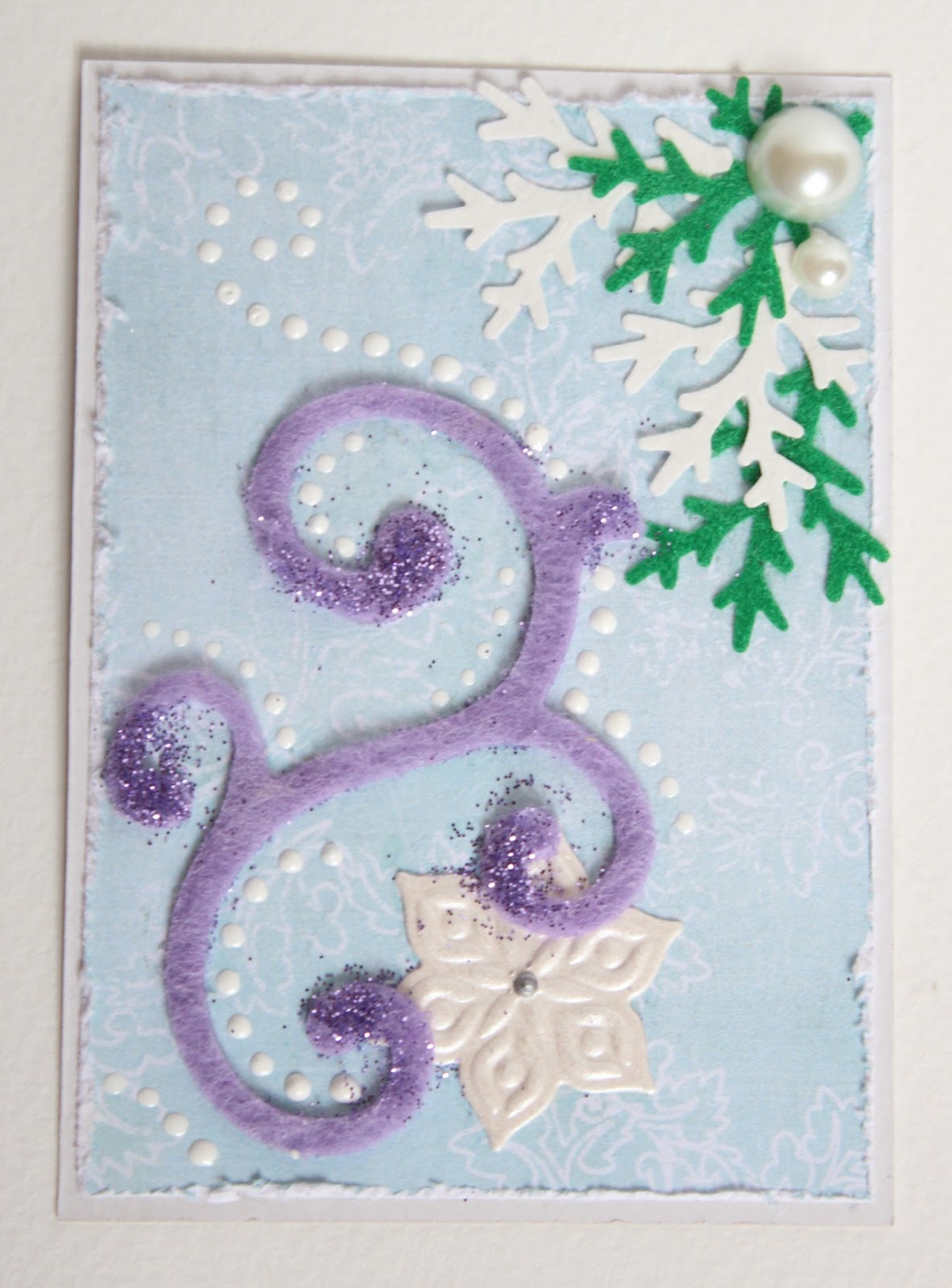 Открыточка простенькая, на фоне - изображение ёлки, полученное с помощью спрея Glimmer Mist от Tattered Angels (цвет Verdigris):